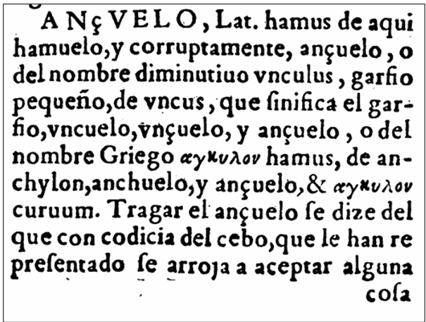 Sin otros similares, cierran la lista el húngaro “horog” y el rumano “carlig”, así que al no haber nada parecido al anzuelo castellano, los etimologistas, en vez de prospectar el significado de la raíz “am”, han seguido la estela que marcara Covarrubias (ver facsímil) y partiendo de un supuesto diminutivo de “hamus” -gancho- “hamicellus” en sus imaginarios proto romances, lo han forzado a “hamiciuolus”, ganchito, deformándose a “amocelo”, “amucelo” y anzuelo….