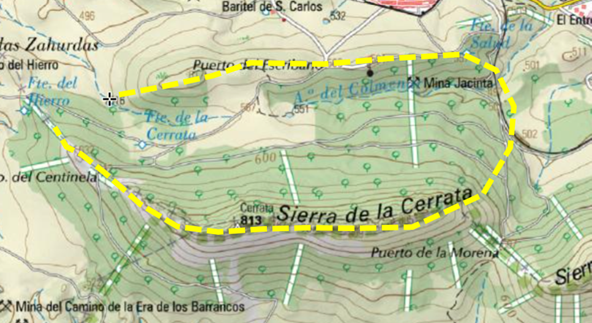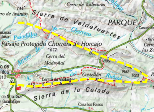 La cuestión es que combinando algunas experiencia obtenidas de contrastar cientos, quizás miles de conjuntos de alineaciones de montañas desde el punto de vista de la gestión de un pastoreo extensivo de escala estatal, se ha podido percibir que, tanto hay grandes elementos estructurales (alineaciones de montañas) como la zona de Babia, en León, el valle de Alcudia en Ciudad Real, algunos valles pasiegos, como muchos cientos de menor dimensión como la Sierra de la Celada y Valdefuertes o la de La Cerrata (imágenes siguientes), que forman confinamientos muy fáciles para el caso de que se necesiten estancias prolongadas del ganado. Y en las que se ha señalado con trazos amarillos el contorno del camino de cumbres que domina el valle.