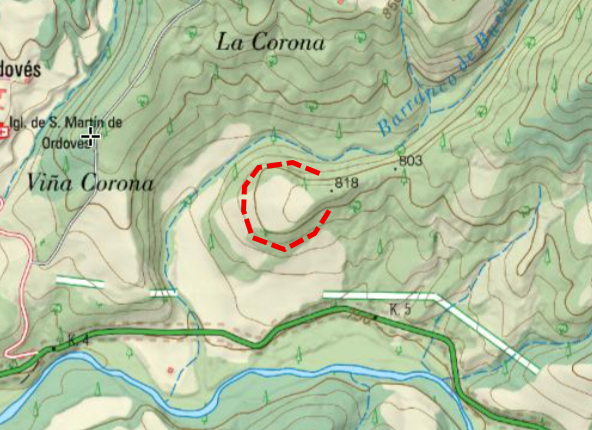 Para terminar por hoy, no es infrecuente en Toponimia; concretamente en los mapas de manejo habitual, que los “carteles” de los nombres se hallen desplazados unos cientos de metros respecto al elemento que originó el nombre; por ejemplo en el Alto Gállego, hay un barranco que se llama La Corona y una cuesta cercana que se conoce como Viña Corona, cuando el elemento que motivó esos nombres (una especie de península que se ha indicado en rojo), carece de apelación particular o se ha olvidado. Imagen siguiente.