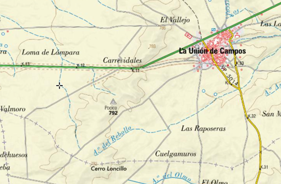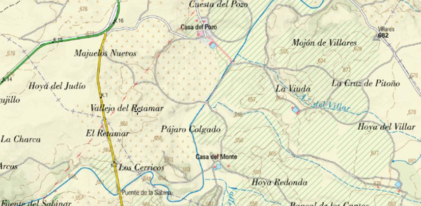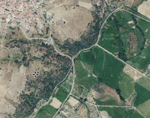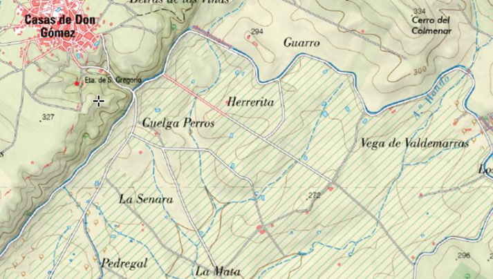 Otro Cuelgaperros cerca de Coria, es una vega totalmente irrigada como se comprueba en los tonos verdes de la ortofoto y en el mapa siguiente.
