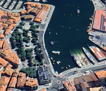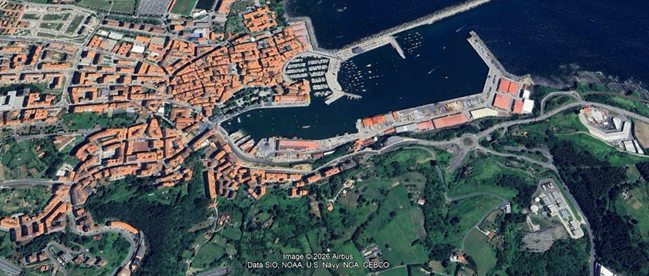De las dos ortofotos que siguen, en la primera no es difícil de adivinar (por la textura del tejido urbano) cual era el perímetro del Bermeo amurallado con su pequeño “Portu zaharra”, que -más o menos- conserva la antigua forma, pero nadie que no sepa la historia reciente de este pueblo, podría imaginar que frente a la muralla urbana, un gran convento franciscano edificado en pleno desagüe se protegía tras otra “muralla de inundación (en la siguiente foto se aprecian sus restos), porque si bien el pueblo estaba sobre una soleada espalda a salvo de las aguas, eran nada menos que cinco, los ríos que desaguaban en el Artza (pedregal), uno de los cuales, el Artigas, era navegable hasta la gran curva que se ve en el segundo mapa y los demás inundaban con frecuencia las riberas, cuando periodos de mucha lluvia coincidían con mareas vivas y grandes depresiones atmosféricas.