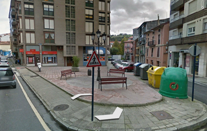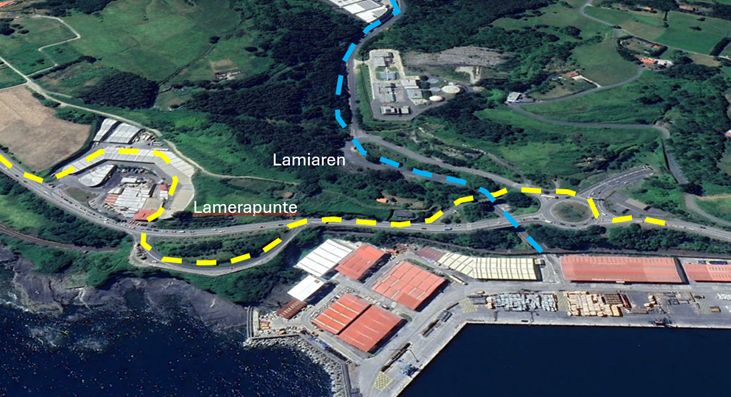 El primero, un hermoso parque de más de hectárea y media, el segundo, el ensanchamiento de un arroyo con unos mil metros cuadrados de superficie, hoy una inhóspita plaza, (dos fotos siguientes) el tercero, un pequeño cabo o promontorio sobre el arroyo Lamiaran, más conocido como Lamiaren, que es el cuarto nombre de esa lista, arroyo (hoy entubado) sobre el que pasaba la antigua carretera Bi-2235 mediante el llamado “Puente de los Gitanos”[2] y que sobre su antiguo cauce se ha establecido el acceso al Puerto Comercial de Bermeo, tercera foto.